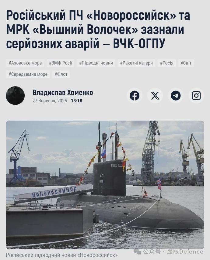 包括“电报”频道“契卡-政保总局”在内,多个消息源透露,当地时间9月27日,隶属黑海舰队第4独立潜艇支队的“基洛”级常规潜艇“新罗西斯克”号在地中海发生严重故障,燃油泄漏到底舱,随时有起火爆炸的危险,被迫进入水面漂浮状态,但潜艇上却既没有零备件也没有合格的维修工程师,潜艇很可能将别无选择被迫打开底舱,将燃油直接排入大海。