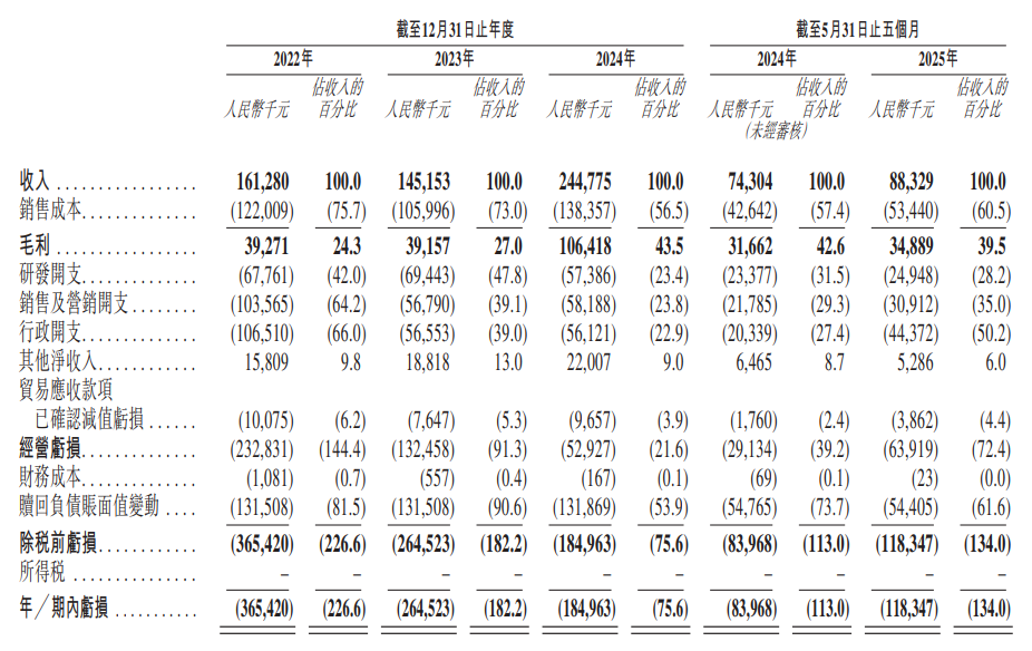 在投资者结构引发的破发担忧之外,云迹的财务数据进一步揭示了其经营的脆弱性。从18C政策对“已商业化公司”的要求来看,云迹虽勉强达标——2024年实现收入2.4亿元人民币,约合2.7亿港元,略超“最近一个会计年度收益至少2.5亿港元”的门槛,但收入的稳定性与盈利前景却充满不确定性。2022-2024年间,公司收入分别为1.6亿元、1.5亿元、2.4亿元,波动幅度明显;2025年前五个月,尽管收入同比增长19%至0.9亿元,但这样的增速缺乏持续增长动力支撑,长期收入能否保持稳定仍需时间检验。更值得警惕的是,盈利端的恶化趋势已十分清晰:2025年前五个月,公司毛利率同比下滑3.1个百分点至39.5%,同期亏损规模更是扩大41%至1.2亿元,上市前夕的财务恶化信号,无疑会进一步削弱市场对其盈利预期的信心。